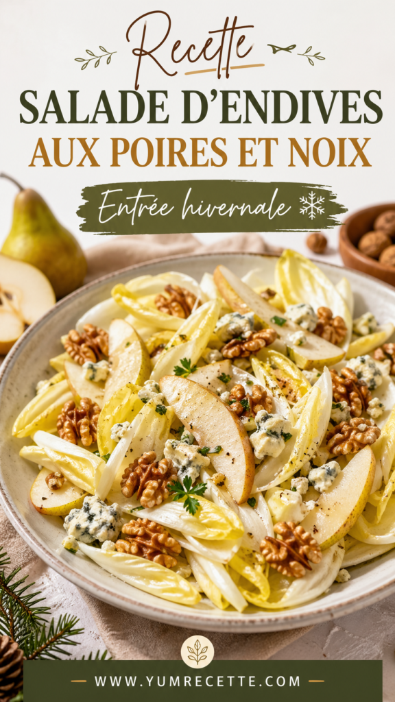 La Salade d’endives aux poires et noix est une entrée hivernale parfaite pour réchauffer les cœurs pendant les mois froids. Ce mélange frais et croquant d’endives amères, de poires juteuses et de noix croquantes crée un équilibre idéal entre saveurs et textures. Facile à préparer, cette salade peut être servie lors de dîners ou de fêtes, et plaît tant aux amateurs de cuisine saine qu’à ceux qui apprécient la gastronomie française.